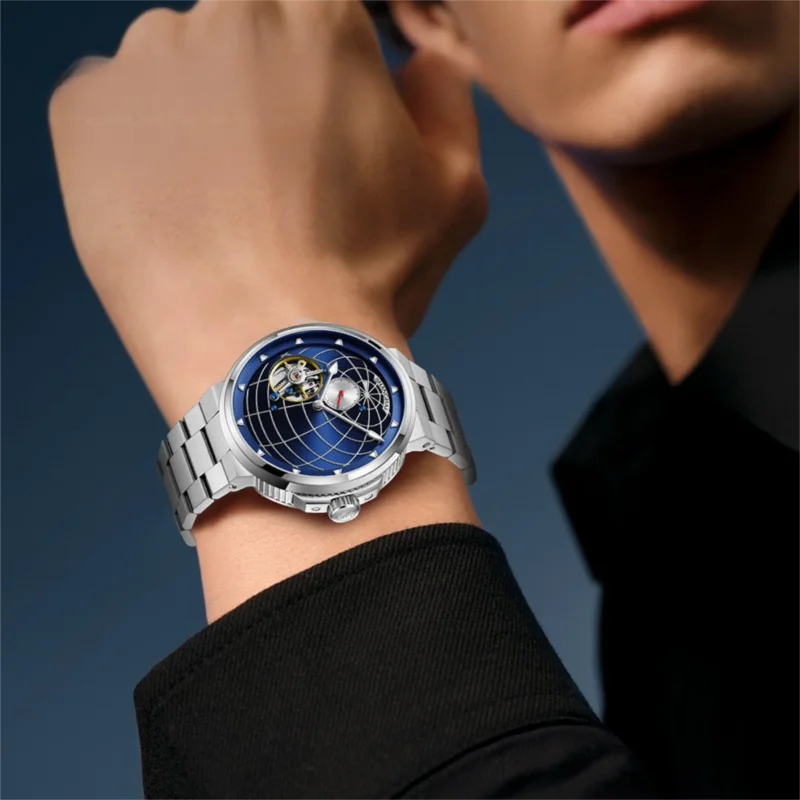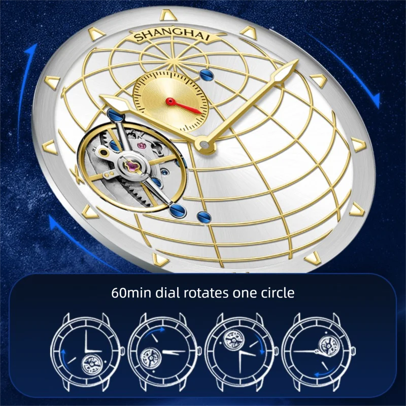 Shanghai Tourbillon Watch Men’s Mechanical Watch Manual Winding Rotating Global Dial Sapphire Waterproof Business Wristwatch